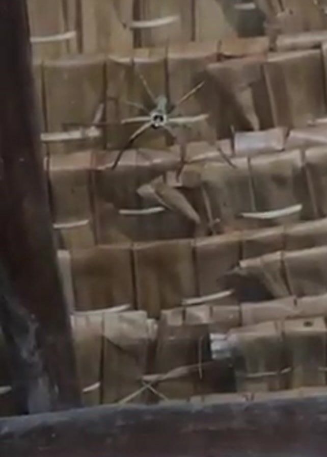 large, light-colored spider on a thatched roof. The camera focuses on the spider, then zooms in and out slightly. The camera angle is from below, looking up at the roof and spider. A dark, wooden frame is visible in the foreground.
