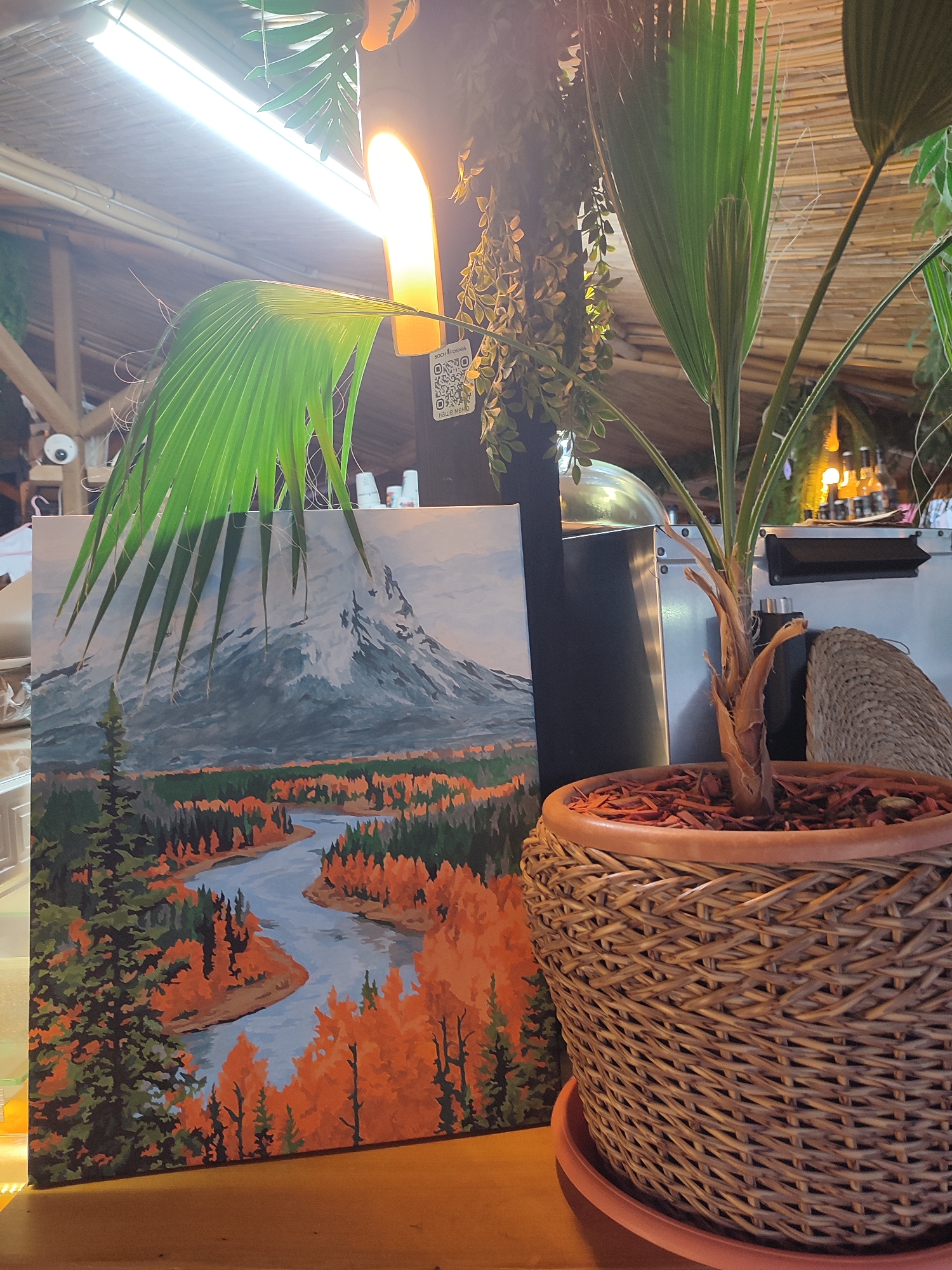 The scene is indoors, possibly in a restaurant or cafe, based on the bamboo-like ceiling, lighting, and the presence of a bar area in the background. In the foreground is a landscape painting depicting a mountain, a river, and autumn foliage. Adjacent to the painting is a potted palm plant in a wicker basket. The painting and plant are placed on a wooden surface. Overhead lighting illuminates the scene. There is no indication of Sirius, Russia.