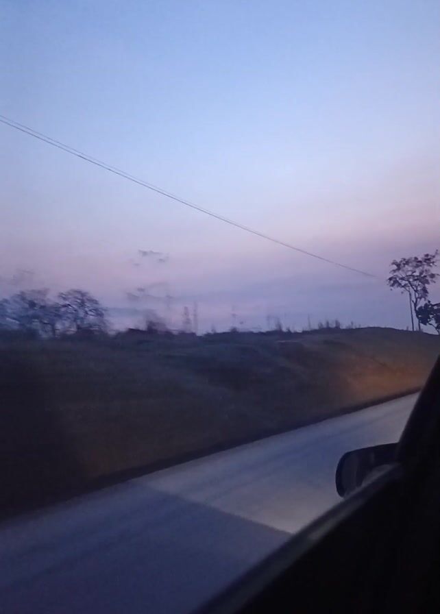 A car travels on a road during twilight. The sky is a mix of blue and purple hues. On the side of the road is a grassy hill, dotted with trees. Power lines stretch across the sky. The video is shot from inside the car, with part of the car's interior visible.