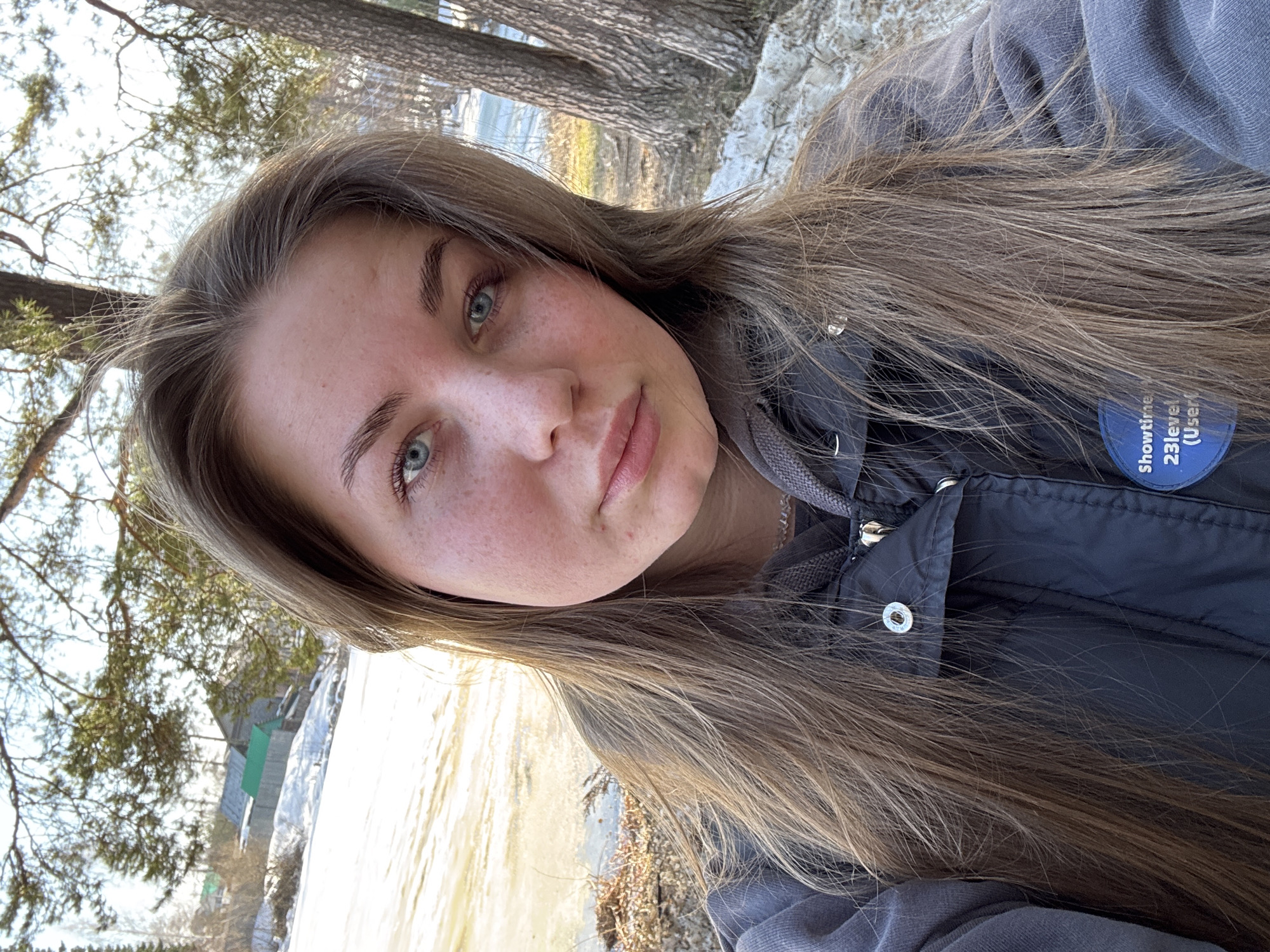 A portrait of a young woman with long brown hair. She has fair skin, freckles, and light-colored eyes. She is wearing a dark-colored jacket with a grey hoodie underneath. The location appears to be outdoors near a body of water, potentially the Kama river, with remnants of snow on the ground and trees in the background. In the upper left side of the shot, it appears there is a building with a green roof. The city of Chaikovsky, Russia is in the Perm Krai region.