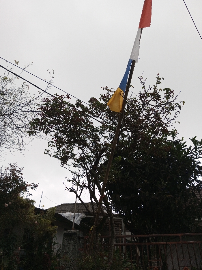 The image depicts an outdoor scene in Ciherang, Indonesia, under an overcast gray sky. A four-paneled flag, horizontally striped red, white, blue, and yellow from top to bottom, is unfurled and attached to a slender, dark pole, possibly bamboo, positioned centrally in the right half of the frame. The white section of the flag shows visible wear. Various trees and dense foliage populate the midground; a tree with sparse reddish-green leaves is to the left of the pole, while a darker, fuller tree stands behind and to the right of it. Two dark utility lines span horizontally across the upper-left sky. Portions of residential structures are visible in the lower-left and center, featuring a dark, corrugated roof and a light-colored, textured wall. A white tarp is draped over a section of the roof, and a dark metal fence is partially visible in the lower right. No individuals, actions, or interactions are present in the scene.