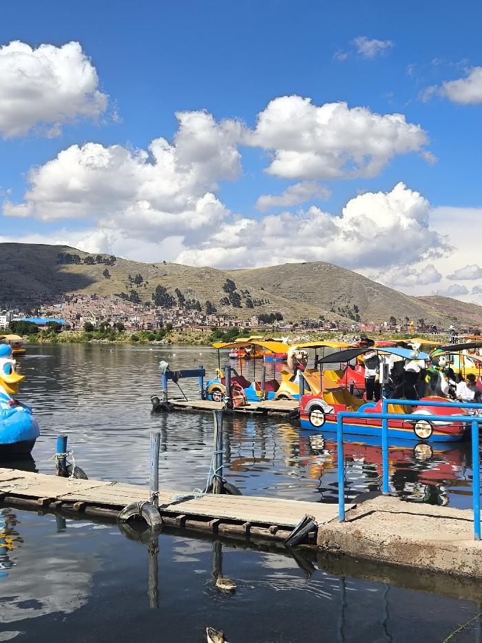 A vibrant lakeside scene unfolds beneath a blue sky dotted with fluffy clouds. A hillside town rests in the distance. In the foreground, a wooden dock leads to colorful, cartoon-themed pedal boats docked on the water. A large blue duck figure sits at the dock's edge. The water reflects the sky and dock structure.