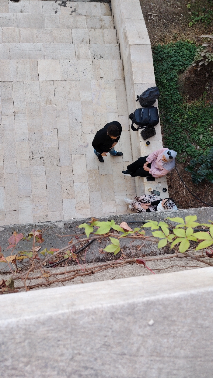 - "From above, a man in black and two women rest on stone steps next to a garden" by FM-YWUCQ2, licensed under CC BY 4.0