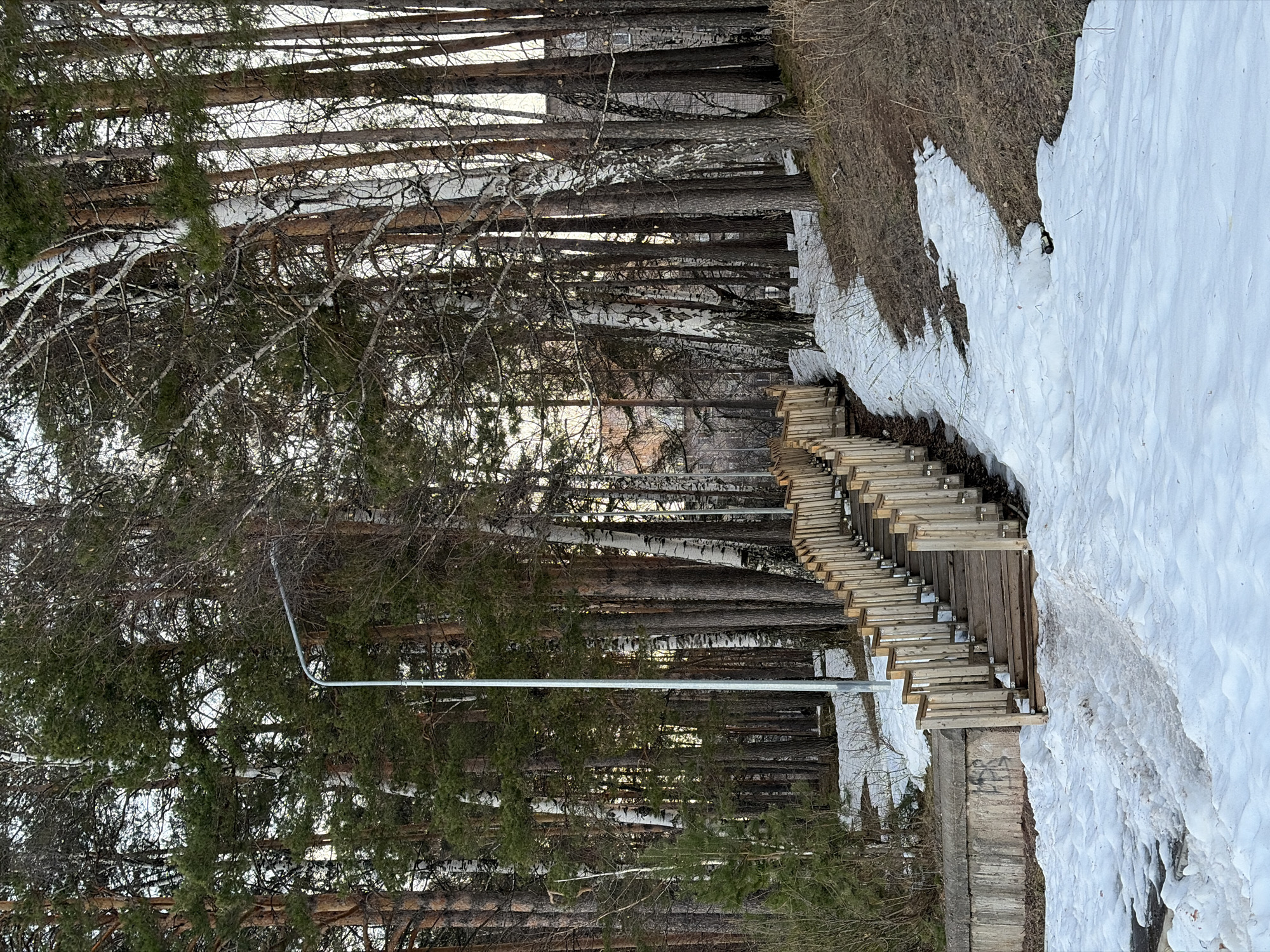 The image depicts a wooded area in what is likely the city of Chaikovsky, Russia, given the prompt. A set of wooden stairs has been constructed along a snowy bank. The trees, consisting of both evergreens and birch, are bare of leaves. A metal light pole stands among the trees to the left of the stairs. The scene suggests a cold, possibly early spring, environment. The absence of people and action focuses attention on the natural setting and infrastructure.
