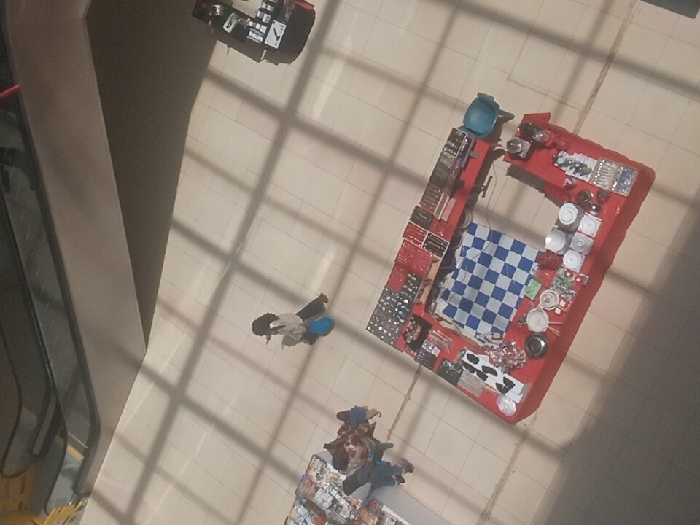 An aerial perspective captures a shopping mall floor with storefronts and shoppers. An escalator is visible on the left edge. The floor is tiled in a light color with dark shadows. Several rectangular retail setups are arranged, one in red, filled with goods displayed on a checkered cloth. Shoppers browse or walk past these areas. A black car is parked in the upper left corner.