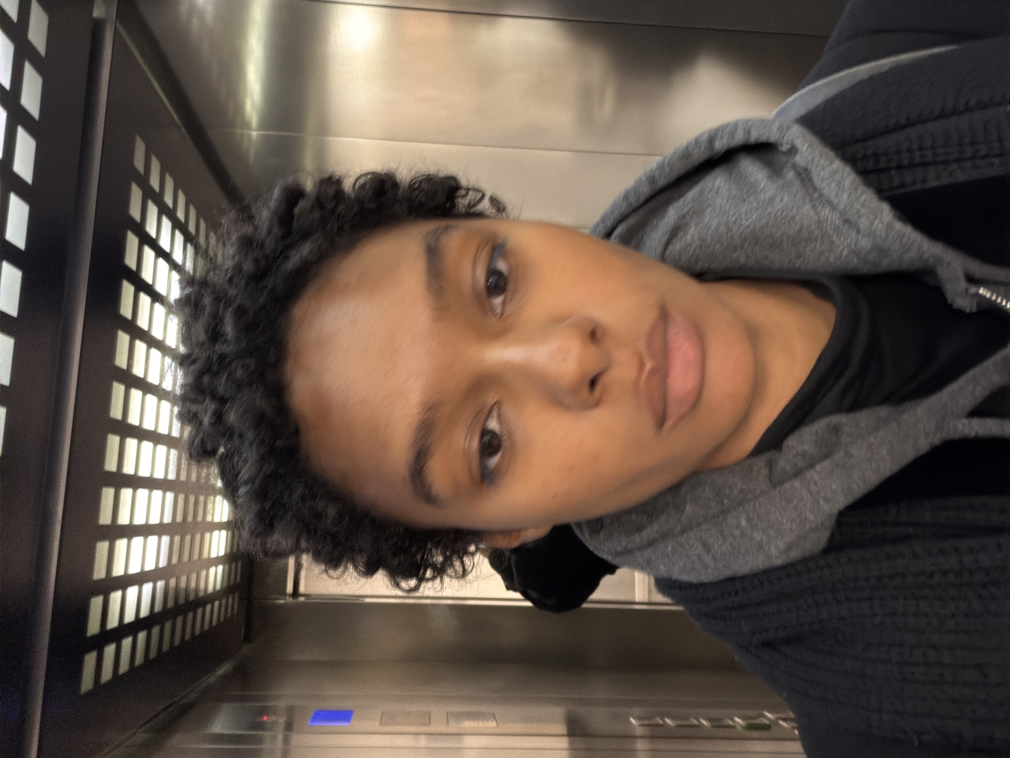 The image displays an adult female inside an elevator located in Pantin, France. The subject, possessing a medium-dark complexion and short, dark, curly hair, faces directly forward, appearing to capture a self-portrait. She is dressed in a black ribbed cardigan worn over a grey hooded sweatshirt, which in turn covers a black top. A subtle application of blue eyeliner is visible on her lower eyelids. The elevator interior features a ceiling with a grid of square, illuminated light panels. The walls exhibit a brushed metallic surface. On the left wall, a control panel is visible, featuring a blue illuminated rectangle and a small red indicator light. A partial, indistinct reflection of a second individual, dressed in dark clothing, is discernible behind the primary subject's left shoulder.