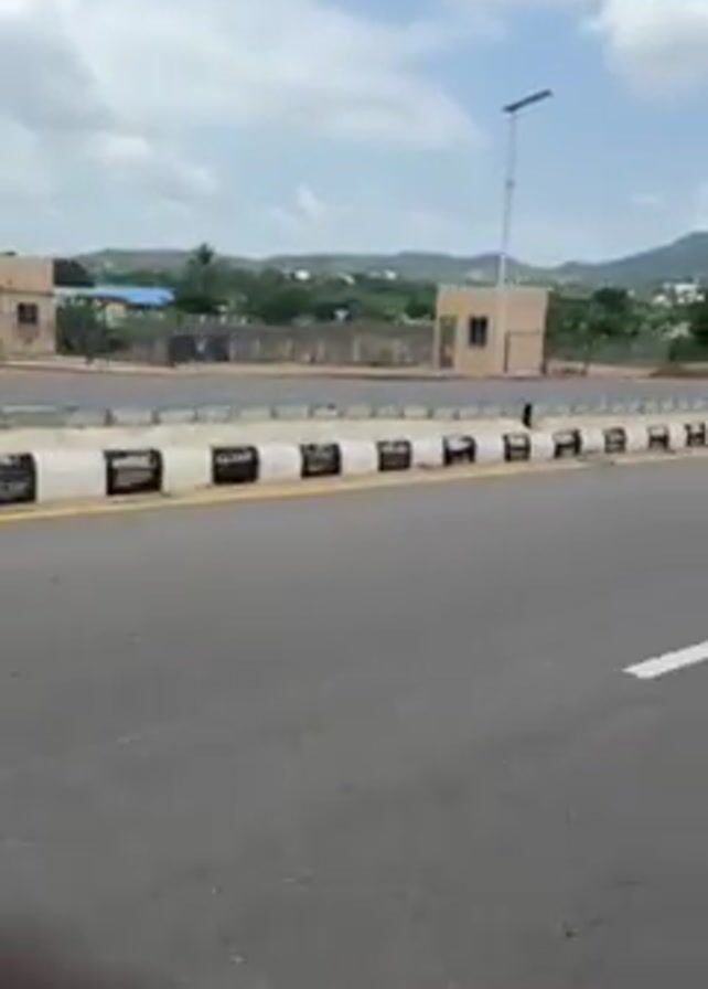 road with a white-and-black curb. A silver car passes by. A yellow building with a red roof is visible near the road, as well as a large tree. In the distance, there are hills and houses. The sky is partly cloudy.