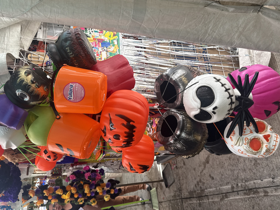 The image displays a street vendor stall in Mexico City, Mexico, primarily featuring Halloween and Day of the Dead-themed merchandise