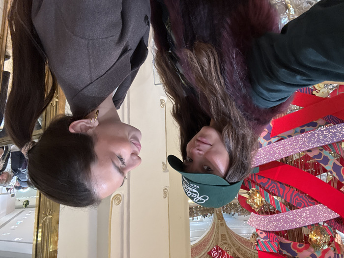 Two women face each other with their heads tilted in an indoor setting. One wears a gray coat, her dark hair pulled back. The other wears a dark shirt with a fur collar and a green baseball cap with white lettering. Red and patterned ribbons are visible in the background, along with a decorative golden structure. The ornate interior includes mirrored surfaces and gold accents. The overall perspective is upside down.