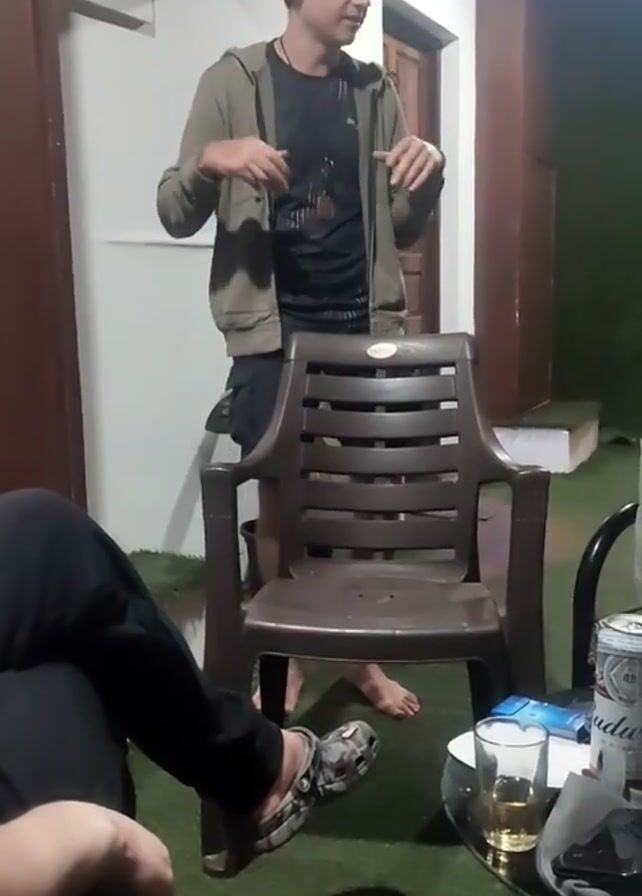 man standing in front of a chair while talking and gesturing with his hands. He is wearing a green hoodie, a black t-shirt, and dark shorts. He is barefoot. There are two other people in the video, seated around a small table. On the table are cans of Budweiser beer, a glass of beer, and other items. The setting appears to be an outdoor patio or covered area with artificial turf flooring. A door and a section of white wall are visible in the background. There is a light fixture above the door, casting a purple beam.