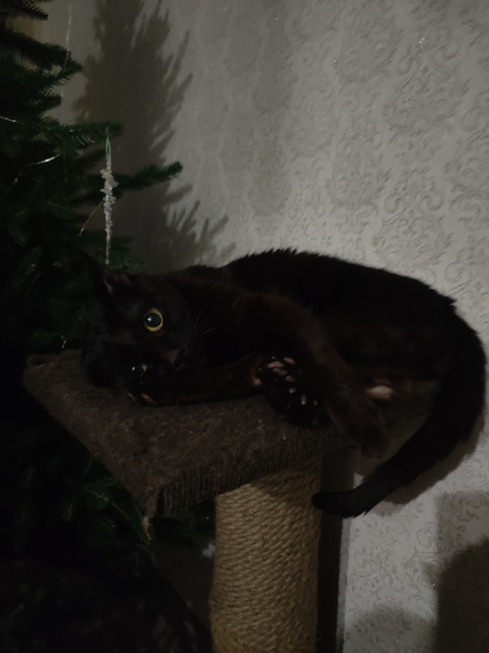- "A black cat rests on a brown, carpeted cat tree next to a Christmas tree" by FM-o6dT83, licensed under CC BY 4.0