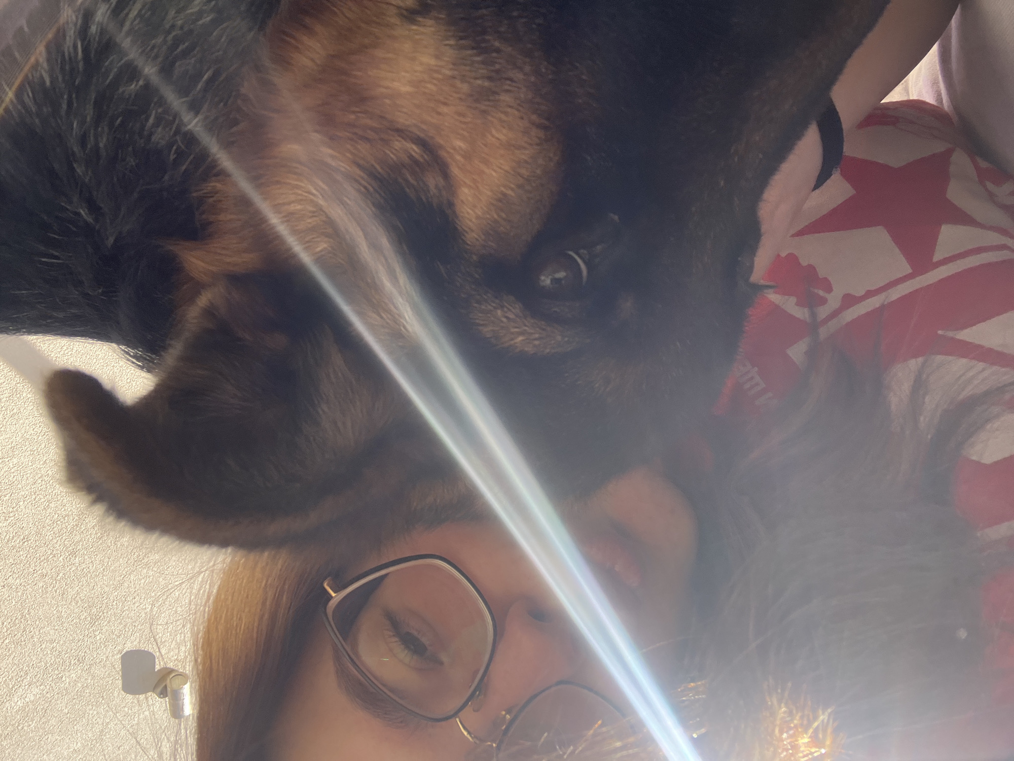 close-up, slightly angled view of a person and a dog, potentially indoors. The person, presumably female, wears glasses and has shoulder-length hair. The dog, a German Shepherd or similar breed, is positioned above the person, with its face dominating a large portion of the frame. Part of a bed pillow with red and white stars is visible near the dog. The overall lighting appears bright, possibly from a window. No city or location information in Samoranovo, Bulgaria is discernible from the image itself.