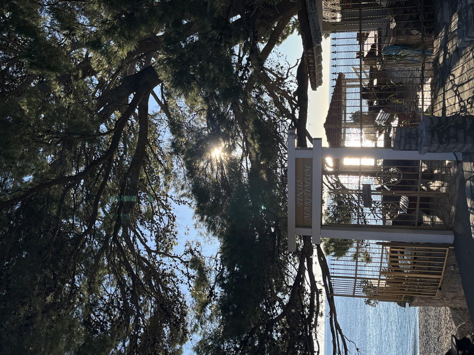 The image depicts a sunlit outdoor scene in Petrovac centar, Montenegro, observed from ground level. A large, mature coniferous tree, likely a pine given its dense needle foliage and visible cones, dominates the upper two-thirds of the frame, casting significant shadows. The sun, positioned low in the sky, is visible through the tree's branches in the mid-right, producing a distinct lens flare and backlighting effect. In the lower center, a white, angular entrance structure with dark metal gates stands prominently. A horizontal sign affixed to the top of this structure bears the inscription "PINUS MARITIMUM" in capitalized brown letters. The two dark metal gates, one with vertical bars and the other with decorative scrollwork, appear closed. A small white sign, largely unreadable due to glare, hangs on the right gate. To the left of the entrance, a section of a narrow, pebbly or sandy beach is visible, meeting calm, blue-green seawater that extends to the horizon. A dark metal fence, consistent with the gates, runs along a low stone wall separating the beach from the area beyond the entrance. Beyond the gates and fencing, an outdoor seating establishment is present. Tables and chairs, dark in color, are discernable within this area. Further back and to the right, a structure with a reddish-brown tiled roof, possibly a gazebo or part of an awning, overlooks the sea. A blue hose or rope is coiled near the base of the fence on the right. No individuals are present in the scene, and no overt actions or interactions are depicted. Long shadows from the tree and structures stretch across the ground in the foreground, indicative of early morning or late afternoon lighting conditions.