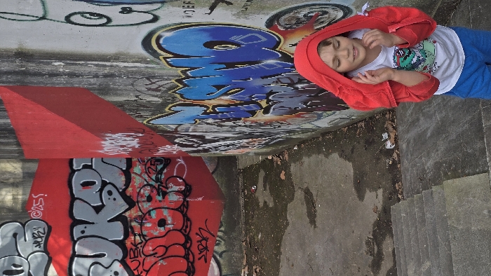 This image captures an urban scene within a concrete underpass structure near Metelkova Mesto in Ljubljana, Slovenia. A young individual, appearing to be a child, stands near the center-right. They are wearing a white t-shirt with a graphic design, blue shorts, and a red hooded jacket draped over their head, obscuring their hair, with the hood pulled up. Their eyes are closed, and both hands are raised in front of their face, palms facing each other. The ground is a wet, cracked concrete surface with scattered brown leaves and a discarded red and white aluminum can. Concrete steps descend along the left side of the frame. The background features multiple concrete walls, including an angular structure painted solid red, all extensively covered with graffiti. Notable graffiti includes large grey bubble letters on a red background on the left and a prominent blue and white piece on the right wall, partially obscured by the individual.