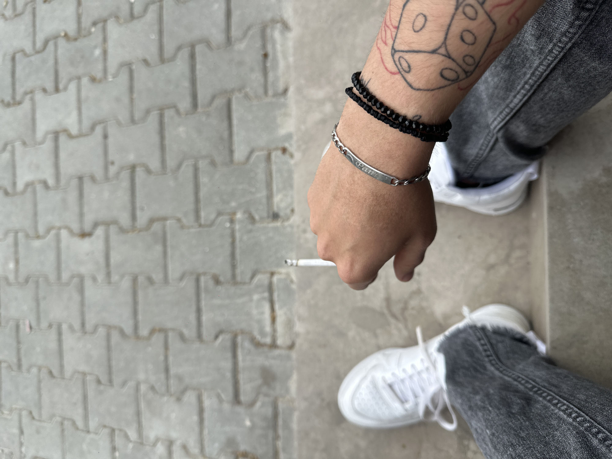 person standing on a paved surface in Petrich, Bulgaria. The pavement is made of gray, interlocking concrete pavers. The person is wearing gray jeans and white sneakers. They have a tattoo of a die on their right forearm and are wearing two bracelets on their right wrist: one is black beaded and the other is a silver chain-link bracelet with a plate. They are holding a cigarette in their right hand.