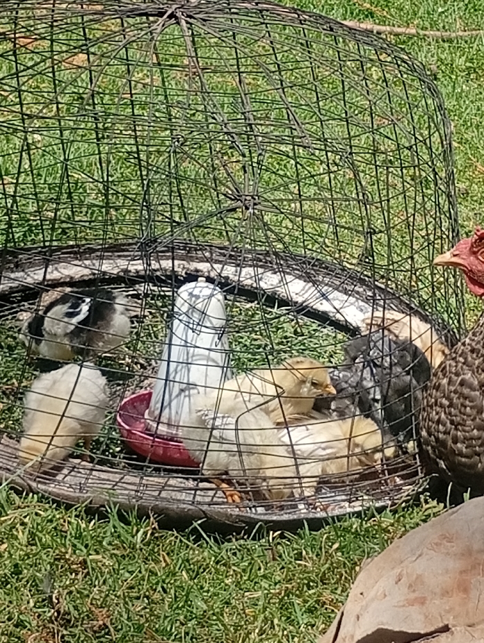 The scene depicts an outdoor environment on a grassy surface in Shamenei, Kenya. A dark, dome-shaped wire cage, seemingly supported by or incorporating a dark tire at its base, occupies the central foreground. Inside the cage, approximately seven chicks are present, exhibiting varying plumage colors including light yellow, cream, grey, black, and white with black markings. A small red plastic feeder and a white plastic water dispenser are positioned within the cage. An adult hen with reddish-brown and black patterned feathers and a red comb is partially visible on the right side of the frame, situated immediately outside the cage and facing towards it. The ground is uniformly covered in green grass, illuminated by bright, natural daylight. No human presence is observed.