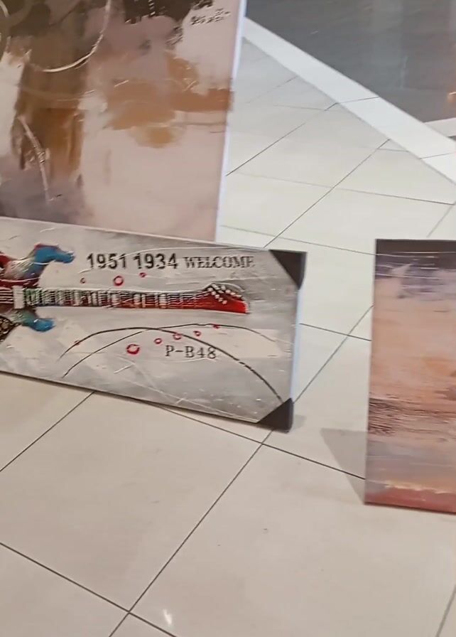 collection of four artworks displayed on a white tiled floor. The first artwork, located in the upper left corner, is an abstract piece with brown and white hues. The second artwork features a depiction of an electric guitar with vibrant colors against a white backdrop, accompanied by the numbers "1951 1934 WELCOME" and the code "P-B4K." The third artwork, positioned on the right, showcases a landscape with earthy tones. The fourth artwork is a landscape painting of a lake and trees, set on a small wooden easel. The scene is set in a shopping mall, evidenced by the reflective flooring and store fronts in the background. The camera pans across the artworks to display them.