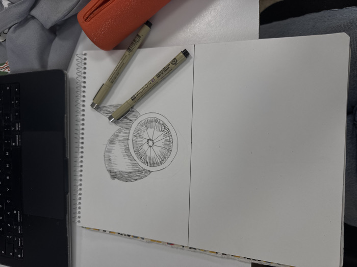 This image, taken in Chablekal, Mexico, displays a tabletop scene centered on a white spiral-bound sketchbook. The left page of the sketchbook features a black ink drawing of a whole lemon and a cross-section of a lemon slice. Two tan Sakura Pigma Micron pens, identified as 01 and 08, rest diagonally across this drawing. A faint vertical pencil line divides the left and right pages of the open sketchbook. To the immediate left of the sketchbook, a dark-colored laptop keyboard is partially visible. An orange zippered pencil case is positioned above the top edge of the sketchbook. A fragment of blue denim clothing is visible along the far right edge of the frame. All items rest on a plain white surface.