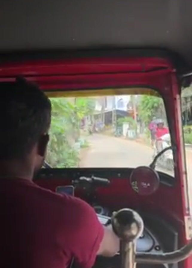 From the perspective of someone seated in the back of a red auto rickshaw, the vehicle is being driven down a narrow street lined with tropical foliage and modest buildings