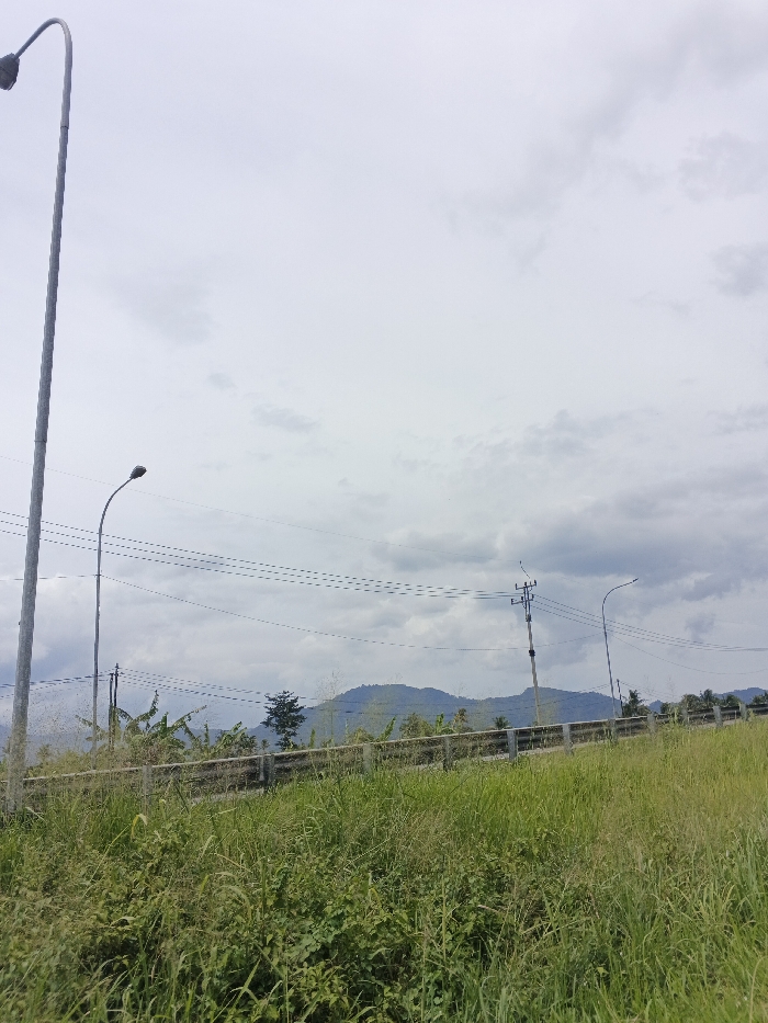 A cloudy sky hangs over a grassy field, where vegetation fills the lower portion of the image. A concrete barrier stretches horizontally across the middle ground. Behind the barrier, a mountain range is visible. Streetlights of varying heights are sporadically placed, with power lines crisscrossing the sky. An electrical pole further adds to the linear elements of the scene.