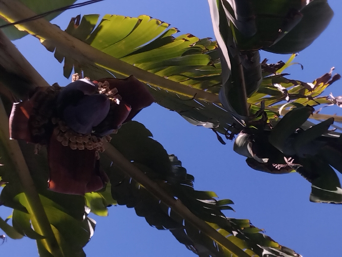 - "The image displays a banana plant's inflorescence, located in Ngong ward, Kenya, captured from a low angle against a clear blue sky" by FM-m6e1C2, licensed under CC BY 4.0