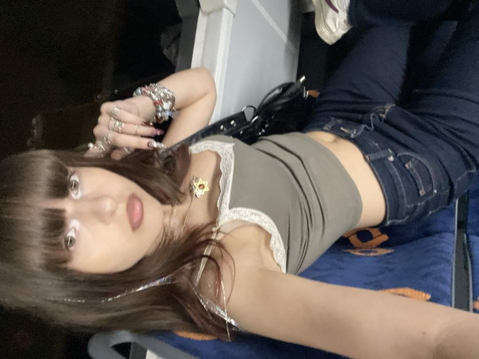 A person lies sideways on a blue patterned seat, wearing dark jeans and a gray tank top with lace trim. Several rings adorn their fingers, along with bracelets on one wrist. They also wear a necklace featuring a star-shaped pendant. Long, brown hair with bangs frames their face, adorned with sparkly tinsel-like strands. A black purse rests near their waist, and a pair of sneakers is visible in the background. The image is rotated, giving a different perspective of the subject.