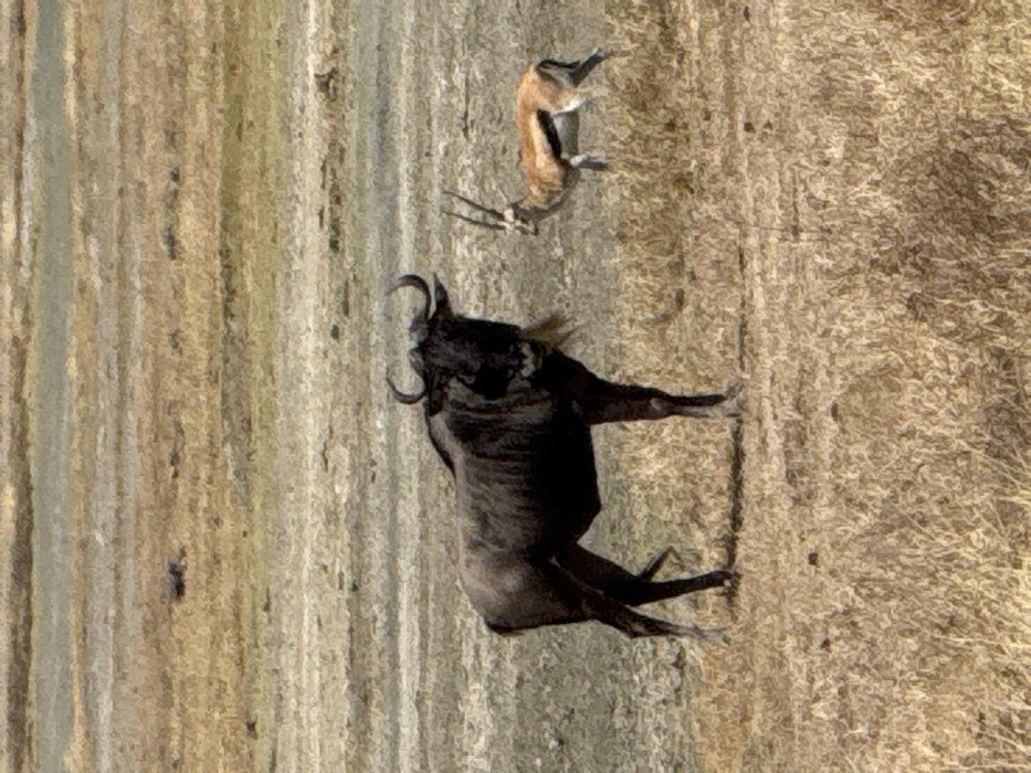 The image displays an arid grassland environment in Mti Mmoja, Tanzania, under natural daylight. A dark-furred wildebeest (Connochaetes), characterized by its large head, curved horns, and a noticeable light-colored beard, stands prominently in the midground, facing forward. To its right and slightly behind, a lighter brown gazelle, distinguished by its white underside, black lateral stripe, and long, spiraled horns, stands facing towards the right. Both animals are static, positioned on a ground covered with sparse, dry, light brown grasses and interspersed patches of bare, lighter-colored earth. The background consists of a blurred expanse of similar dry, open terrain, devoid of prominent vegetation or structures. No human subjects or man-made objects are present.