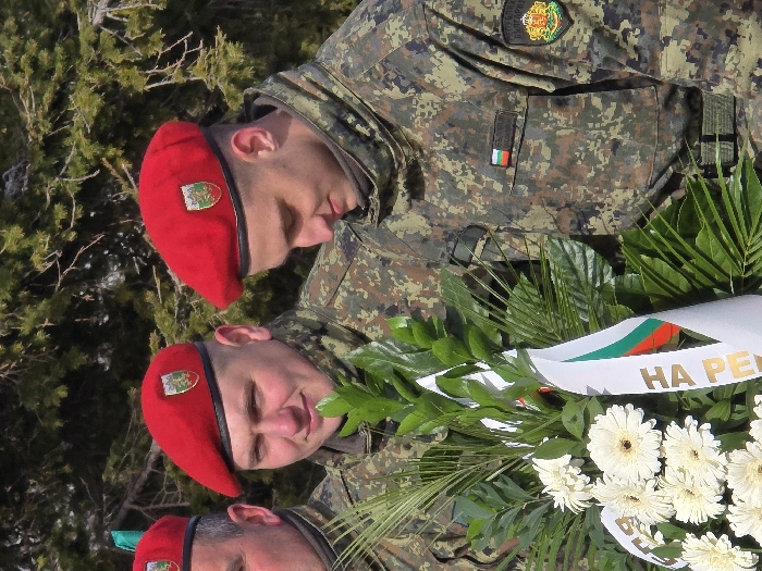 In the city of Shipka, Bulgaria, a daylight, medium-shot photograph shows three male individuals, two clearly visible, in Bulgarian military camouflage uniforms