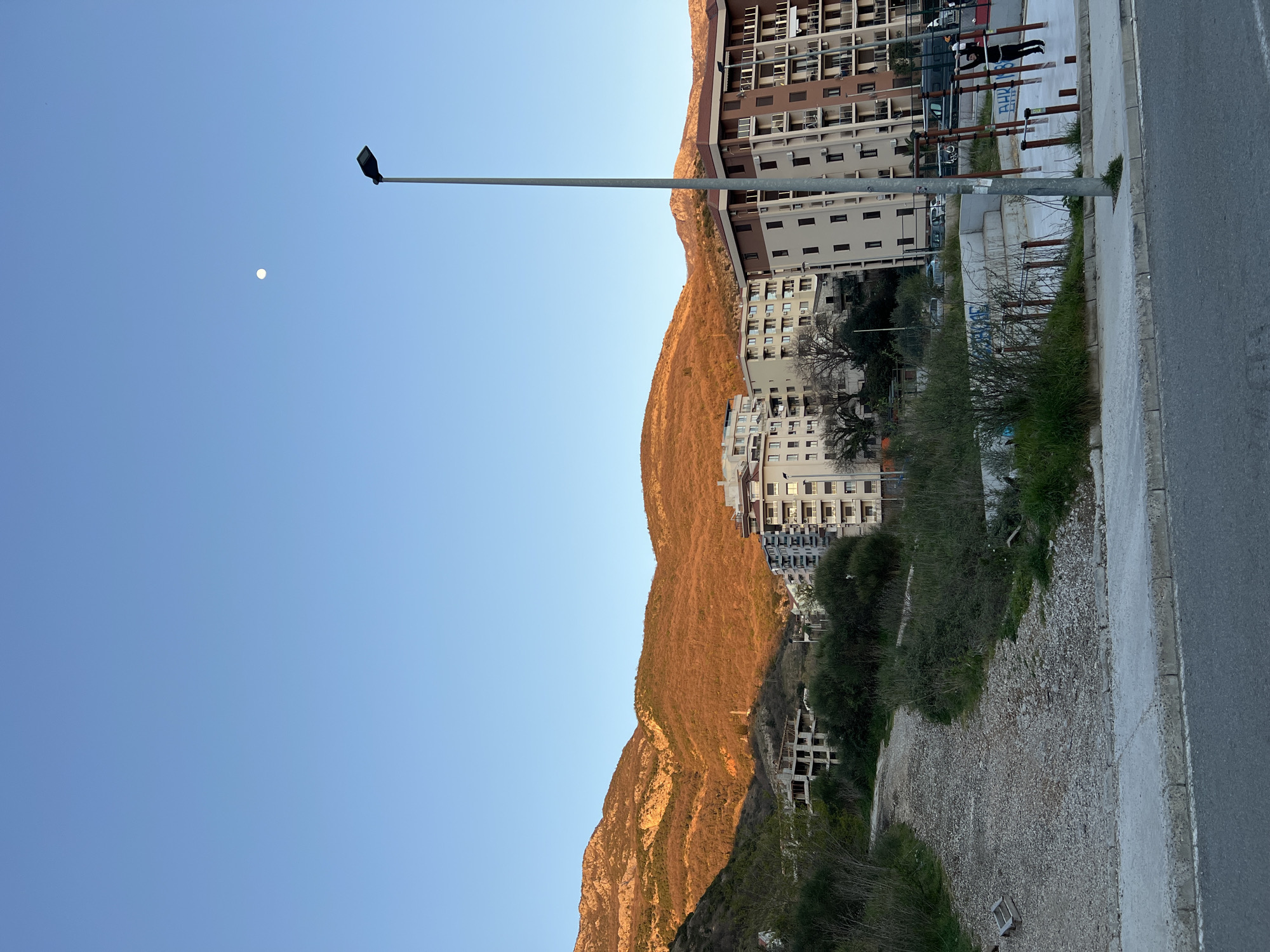 The image presents a view in Boreti, Montenegro, featuring a mountain range illuminated by warm sunlight, contrasting with the clear blue sky where a small moon is visible. A street lamp stands tall against the sky. Adjacent to the mountain, multi-story apartment buildings are constructed, and a few individuals can be observed on a fitness area. A road borders the scene. The buildings and roadside are in shadows.