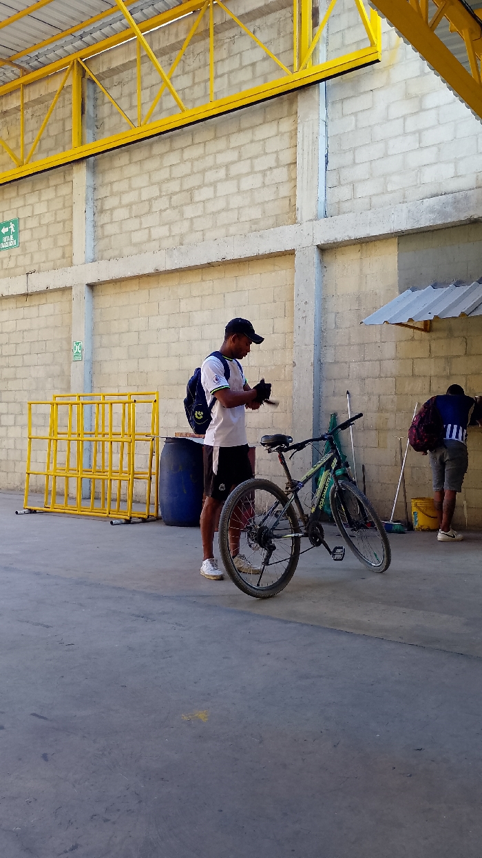An outdoor shot shows a man with a backpack and cap, looking at something in his hands, beside a bicycle. Another man stands near a wall with a container and other supplies. There is a blue barrel, yellow racks, and a light-colored concrete wall in the background. The building has a visible yellow metal framework overhead and a concrete floor. The scene appears to be near a loading dock or an industrial area.