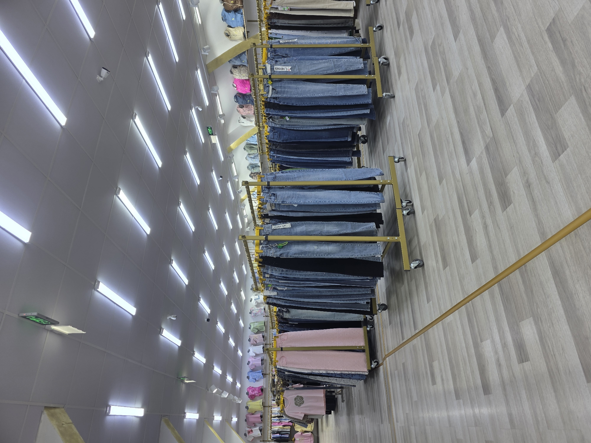 This is an interior view of a clothing store in Lom, Bulgaria. The floor is covered with light wood-grain laminate, crossed by a yellowish-brown cord or strip. The white drop ceiling is brightly illuminated by numerous rectangular fluorescent light fixtures and several recessed spotlights. Two green "EXIT" signs and two dome-shaped security cameras are visible on the ceiling. The store contains multiple gold-colored, wheeled metal clothing racks predominantly displaying blue denim jeans and trousers, with some black and pink studded trousers also present. Along the back wall, assorted short-sleeved tops in colors such as pink, yellow, blue, and white are hung on hangers, with several puffer vests in colors like pink, blue, and brown stacked on shelves above them. A light pink short-sleeved top featuring a large floral embellishment is visible on a hanger in the left foreground. No individuals are present in the scene.
