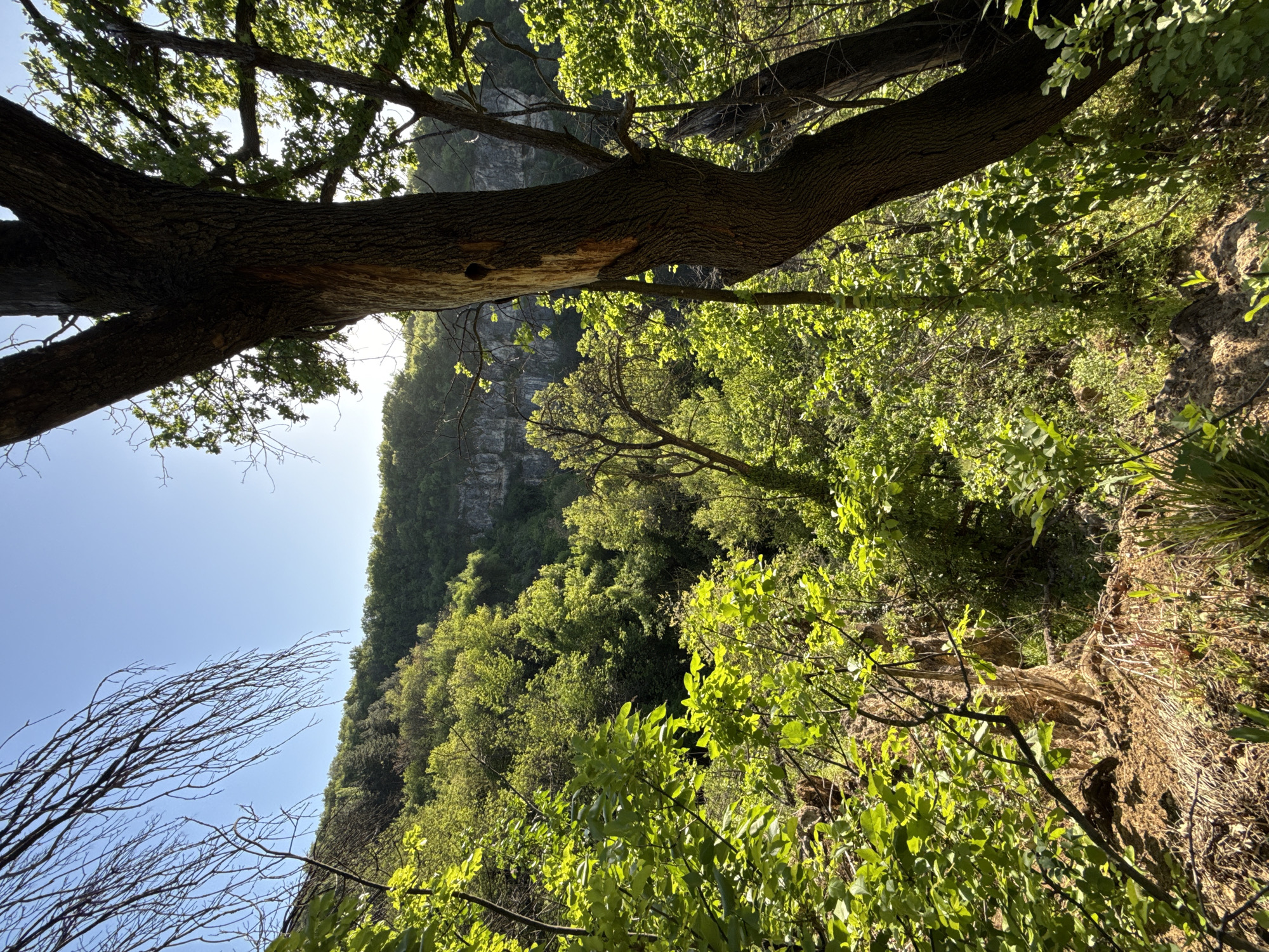 The image presents a landscape scene in Krushuna, Bulgaria, featuring trees, a hillside, and a cliff face under a clear blue sky. The prominent feature is a large, mature tree with thick branches extending into the frame from both sides. The cliff face is visible in the background, partially obscured by dense vegetation. The hillside is covered in lush greenery, including various trees and shrubs. The perspective is tilted, giving an upward view of the scene. The sun is positioned behind the cliff, creating a slight halo effect and dappling the scene with light and shadows.
