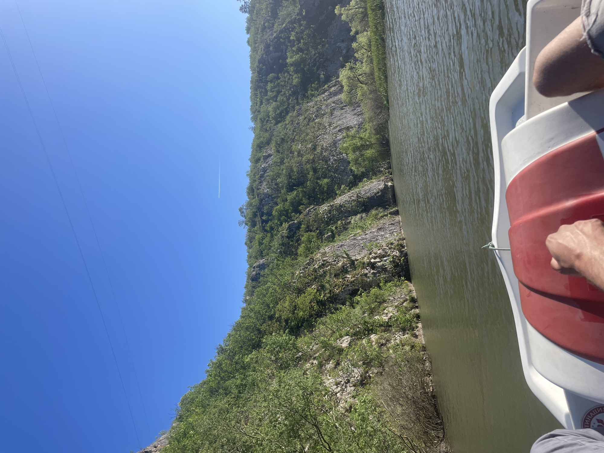 View from a red and white boat on a river in Lukovit, Bulgaria. A steep rocky hillside covered with green vegetation rises along the riverbank. A clear blue sky is visible overhead, with overhead power lines and a contrail.