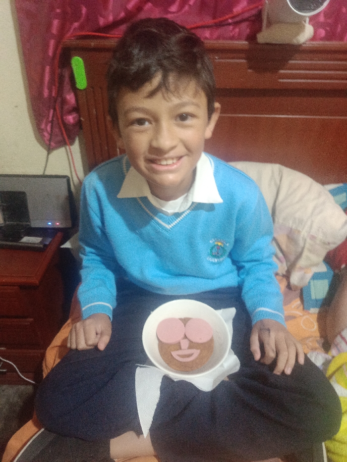 A young boy with dark hair, wearing a light blue V-neck sweater over a white collared shirt and dark trousers, is seated indoors in what appears to be a residence in Amaguaña, Ecuador. He is smiling directly at the viewer, holding a white bowl in his lap with both hands. Inside the bowl, a brown circular base is visible, adorned with food items arranged to form a face: two pink oval shapes serve as eyes, a smaller pink oval for a nose, and a light-colored curved shape for a mouth. The background on the left side shows a red curtain or fabric and a wooden bedside table with a dark electronic device displaying two blue indicator lights. On the right, a wooden headboard and a patterned pillow on a bed are partially visible.
