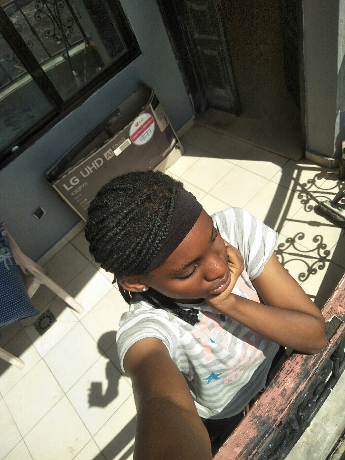 A young female, identified in Cotonou, Benin, is depicted in a selfie, positioning herself behind a weathered, reddish-brown railing
