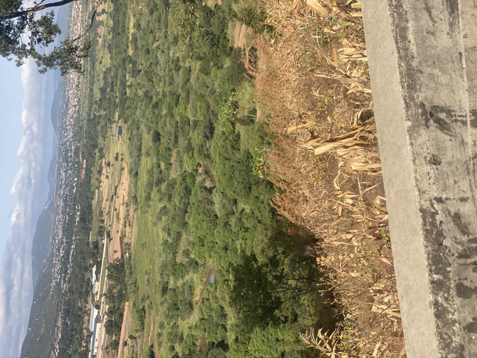 view from a hillside in Iringa, Tanzania, looking down upon a valley. The valley is filled with a dense forest of green trees. A small river or stream is visible winding through the valley. The hillside is covered in dried corn stalks and a concrete wall at the bottom of the image. In the background, a city can be seen in the distance, nestled between the base of hills. There are no people visible. The sky is cloudy.
