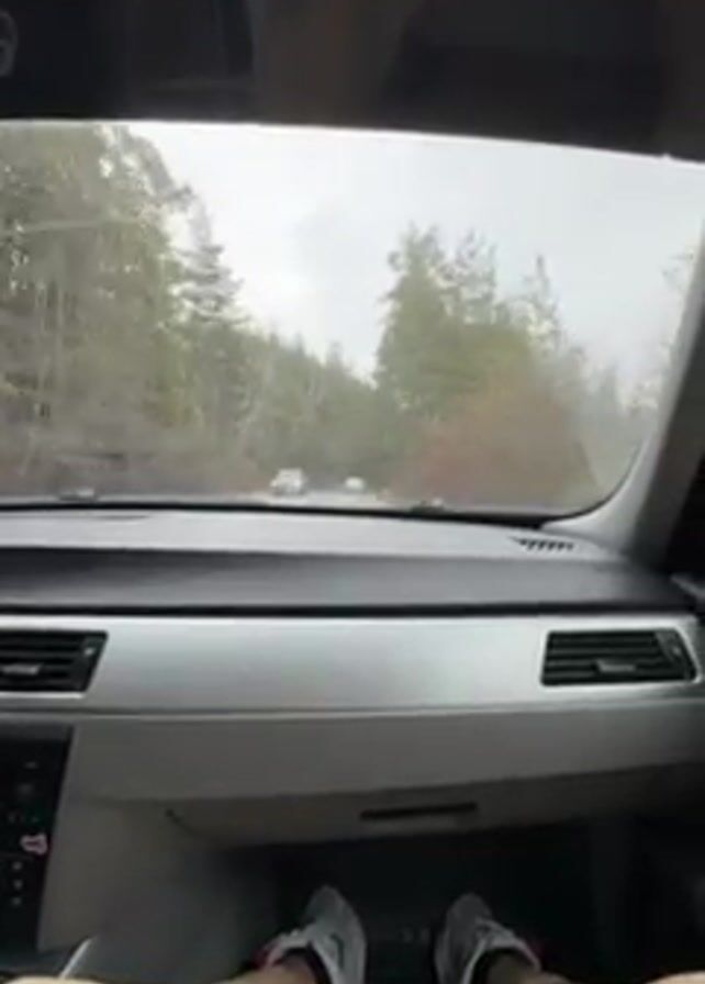 car's dashboard and a driver's legs and feet as they drive down a tree-lined road on a rainy day. The car has a silver dashboard and black floor mats, and the driver is wearing tan pants and white sneakers with red accents. Other vehicles are visible on the road ahead. The windshield wipers are active. There appears to be camping gear strapped to the roof of the car.