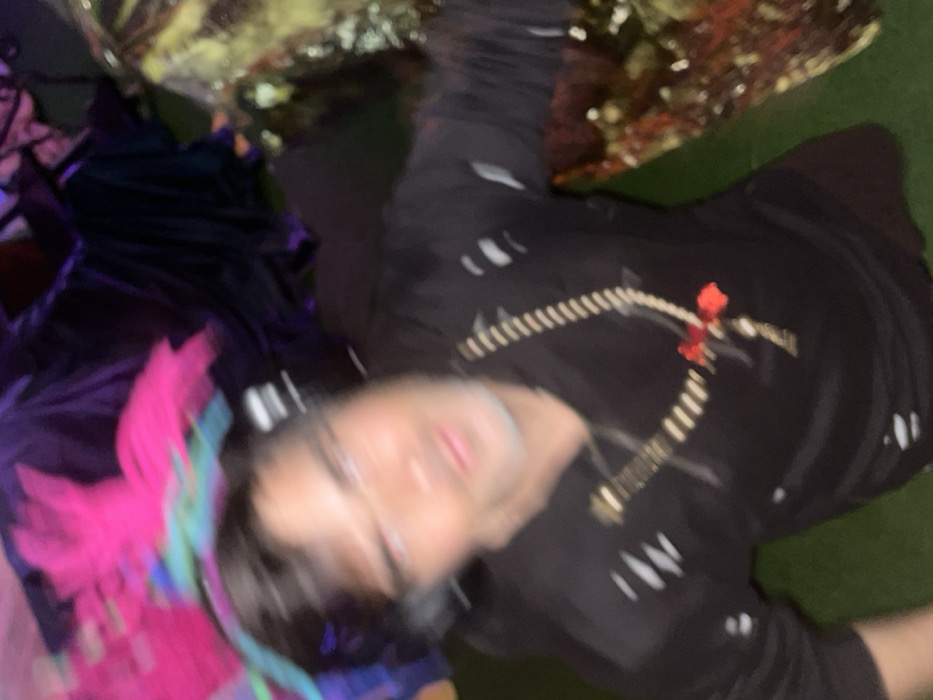 A blurred image shows a person laying down. They wear a black shirt with white markings and a decorative rope-like item. Their face is slightly out of focus. To the left, there are colorful fabrics with pink and blue hues. Above the person, there is a metallic-looking material. The background also includes hints of green, possibly grass. The overall composition is somewhat unclear due to the blurring.