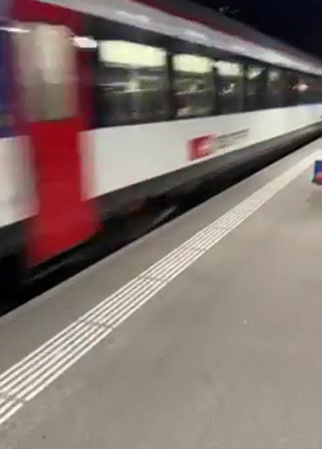 train moving along a railway platform. The train is white with a red stripe. The train is labeled SBB CFF FFS. The platform is gray and has white textured stripes. The video is taken from a low angle. The video is taken at night.