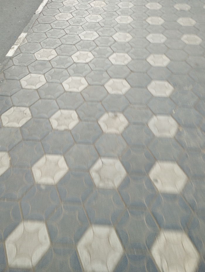 The image displays a patterned walkway composed of hexagonal paving stones
