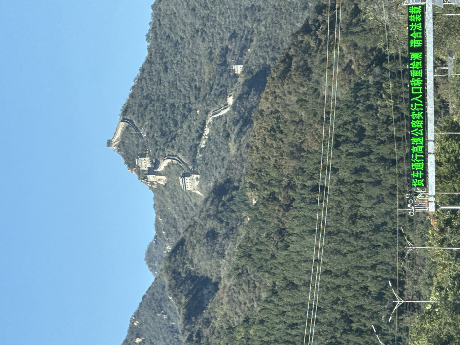 This image depicts a section of the Great Wall of China winding across densely forested mountains under a clear blue sky, located within Changping District, Beijing, China. The upper two-thirds of the scene are dominated by a rugged, mountainous landscape. The mountains are covered with a mix of dark green evergreen trees and lighter green/brownish deciduous foliage, suggesting a season outside of full summer. The Great Wall, appearing as an ancient stone and brick structure, traverses the ridgelines and slopes, exhibiting multiple turns and undulations. At least three distinct watchtowers are visible along the wall: a prominent pair of multi-story watchtowers are situated on a central ridgeline, while a smaller watchtower is visible further to the right on a lower slope. In the lower third of the image, elements of modern infrastructure are present. Several horizontal power or communication lines stretch across the mid-ground. Below these, two multi-armed streetlights are partially visible on the left. To the right, an overhead gantry supports a long, horizontal electronic display board. The board displays illuminated green Chinese characters which translate to: "Trucks passing through expressways are subject to weighbridge inspection at the entrance. Please load legally." No people or vehicles are visible in the scene. The overall lighting suggests daylight conditions with a clear sky.