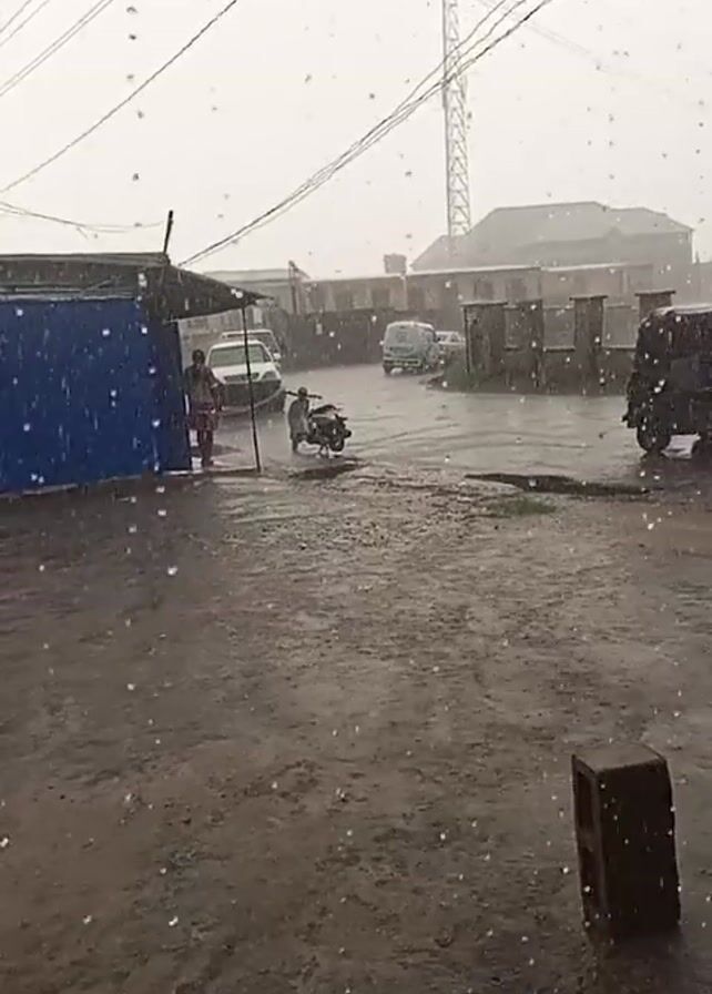 The scene captures a street under heavy rainfall. A blue makeshift shelter stands to the left, with two people under its cover. A motorbike is parked nearby. Across the street, various vehicles, including cars and a minivan, are visible. A three-wheeled auto-rickshaw drives by. A tall telecommunications tower rises in the background behind some buildings. The ground is wet and reflective due to the rain. A single brick lies in the foreground. Overhead are power lines stretching across the sky.