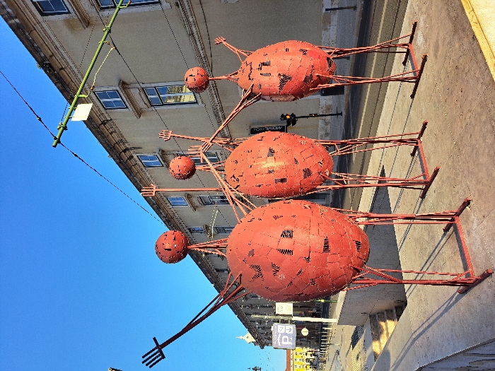 - "The image displays three large, red, anthropomorphic sculptures positioned on an elevated concrete walkway under a clear blue sky" by FM-jYNYq2, licensed under CC BY 4.0