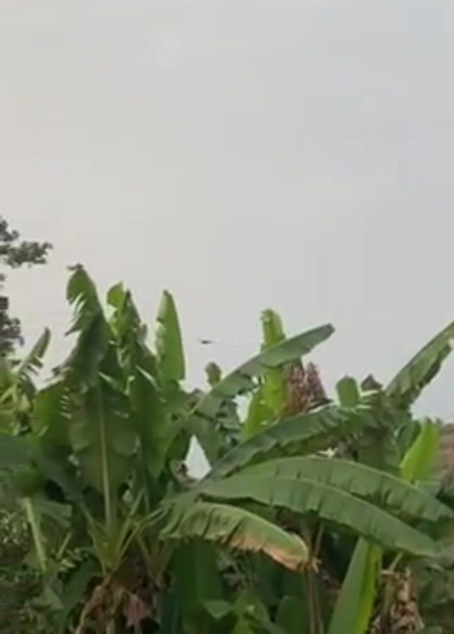 view of trees and plants against a cloudy sky. In the foreground, there are several banana plants with large green leaves. As the camera pans upwards and slightly to the left, taller trees with thicker foliage become visible. In the distance, what appears to be parts of buildings with red roofs can be seen. The overall environment appears to be lush and green, suggesting a tropical or semi-tropical setting.