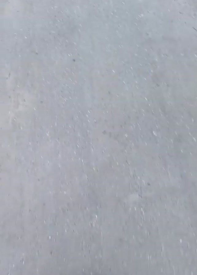 single, dark, leather shoe walking on a gray asphalt surface. The camera appears to be held by the person wearing the shoe, as the perspective is directly down towards the ground. The surface is textured and uneven, indicating it is likely a road or a paved area. The lighting suggests it is daytime, but potentially overcast, as the shadows are soft. The shoe appears to be moving forward at a steady pace.