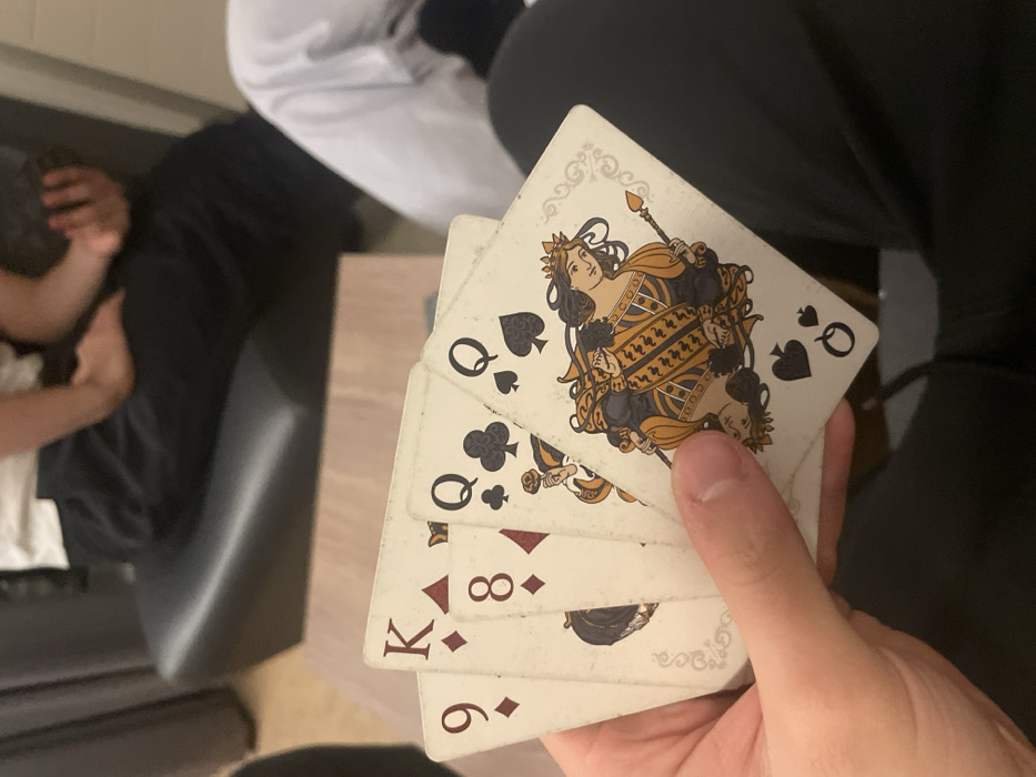 The image depicts an indoor scene in The Hague, Netherlands, from a first-person perspective. In the immediate foreground, a human hand with fair skin holds a fanned array of five playing cards: the 9 of Diamonds, King of Hearts, 8 of Diamonds, Queen of Clubs, and Queen of Spades. The cards exhibit an ornate, vintage design and show visible signs of wear and minor discoloration. A light-colored wooden or laminate surface, likely a table, is partially visible directly beneath the cards. In the blurred midground and background, portions of at least two other individuals are discernible. To the upper left, a person wearing a white t-shirt and dark trousers is seated on a dark, cushioned piece of furniture, possibly leather or faux leather. Their left arm is visible, resting. To the right, a leg clothed in white trousers is partially visible. The background consists of indistinct light-colored walls or flooring, and dark furniture.