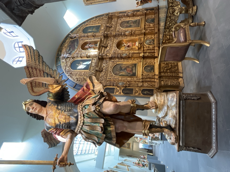 A vibrant image captures a gilded statue of an angel, positioned heroically with wings spread and sword in hand. The angel wears ornate armor with red cape and rests one foot atop a decorative base. Behind the statue, an equally ornate golden altarpiece adorned with paintings and sculptures stands tall. A window can be seen in the background.