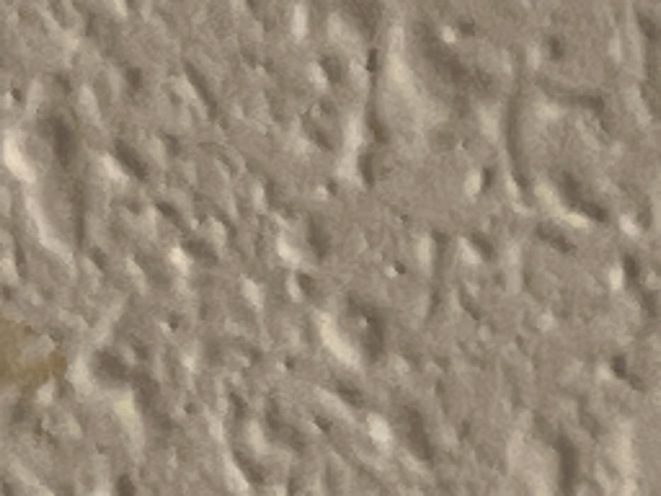 The image presents a close-up, high-magnification view of a textured surface, located in Bischheim, France. The surface is predominantly a light beige or off-white color, exhibiting an irregular, three-dimensional relief pattern. This texture is characterized by numerous small to medium-sized raised bumps, ridges, and depressions, creating a mottled, granular appearance. Variations in light and shadow across the surface highlight these topographical features. Specific areas, particularly in the upper portion, display slight yellowish discoloration. No individuals, discernible objects beyond the surface itself, or actions are depicted within the frame. The environment is limited to this highly textured architectural surface.