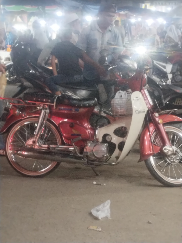 The image captures an outdoor night scene in Keudegeudong, Indonesia, illuminated by artificial light sources. A prominent red and cream-colored Honda Cub motorcycle is parked centrally, facing right. It features chrome spoked wheels, a black ribbed seat, a chrome luggage rack over the rear fender, and cream-colored leg shields with circular black accents. The motorcycle's headlight emits a strong glare. On the ground in the foreground, a crumpled white plastic bag and a small piece of debris are visible. Directly behind the red motorcycle, a person wearing a dark t-shirt and blue jeans is seated on a black scooter-style motorcycle. To their right, a man wearing a light-colored shirt and a dark cap stands near the handlebars of the red Honda. The background is blurred, showing numerous indistinct individuals, additional vehicles, and multiple bright overhead lights beneath what appear to be temporary tarpaulin coverings, indicating a bustling market or street environment.