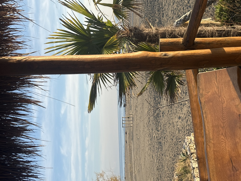 The image depicts a beachfront scene in Donji Štoj, Montenegro, observed from beneath a thatched structure. In the immediate foreground, a portion of a straw or dried grass thatched roof hangs from the top, casting shadows. To the right, a thick, rounded wooden post serves as a structural support, with a horizontal wooden beam forming a railing or part of a bench system visible in the lower right. A flat, light brown wooden surface, possibly a bench or tabletop, occupies the lower left corner. The midground reveals an expansive, dark sandy beach devoid of individuals. Sparse, dry vegetation, including a small agave-like plant on a low stone wall, is visible on the left. Several palm trees with green, fan-shaped fronds are situated to the right, behind and next to the wooden post. Further along the beach, centrally located, is a minimalist wooden structure composed of four vertical posts with at least one horizontal crossbar. In the background, the calm, blue waters of the sea extend to the horizon under a light blue sky with scattered wispy white clouds. The scene is illuminated by natural daylight, casting visible shadows. No people are present, and no actions or interactions are depicted.